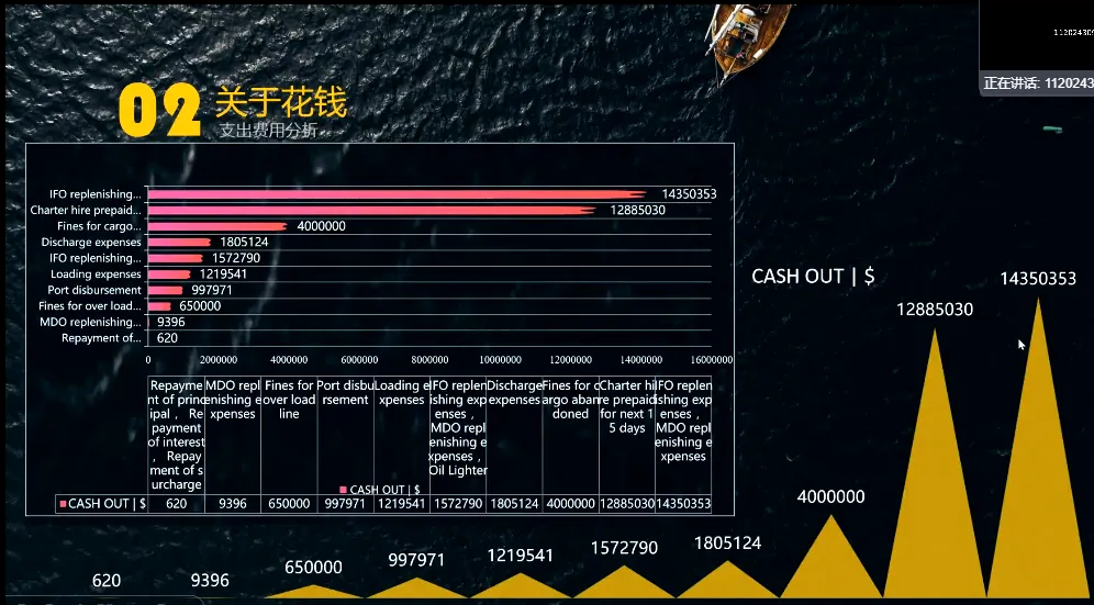 4) 每个航次的成本支出(租金、油耗、港口使费)占比。