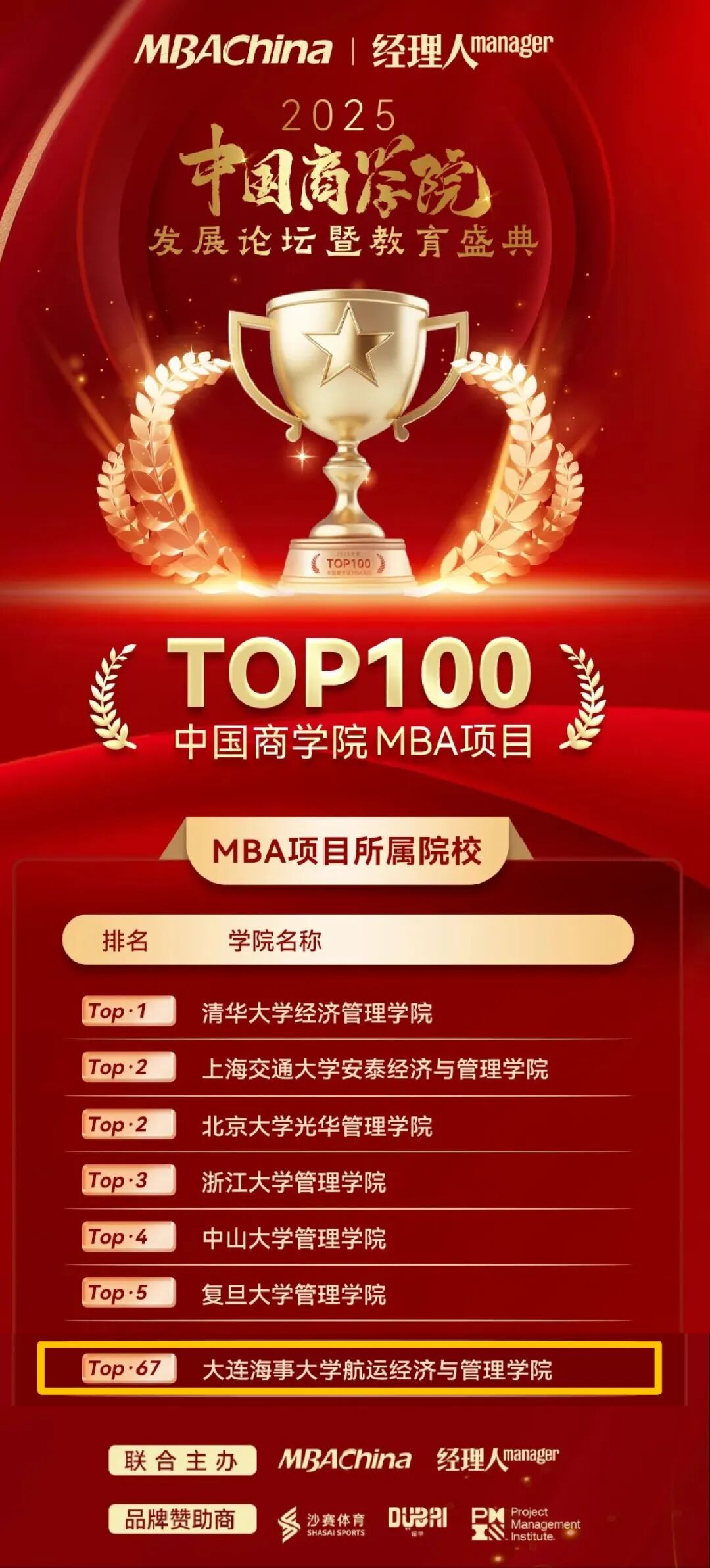 盛典现场,备受业界瞩目的 “2025年度中国商学院MBA项目TOP100榜单” 权威发布。大连海事大学MBA项目凭借扎实的办学实力、鲜明的航运特色,以及卓越的培养质量,成功入选全国百强,位列第67位!